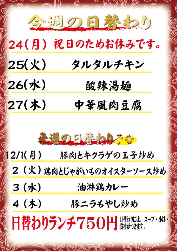ランチは4日間のお休み頂いて今日からまた木曜日までよろしくお願いします!今日の日替わり定食は【タルタルチキン】!15時までにお店に入ればランチをご利用頂けますよ〜!!