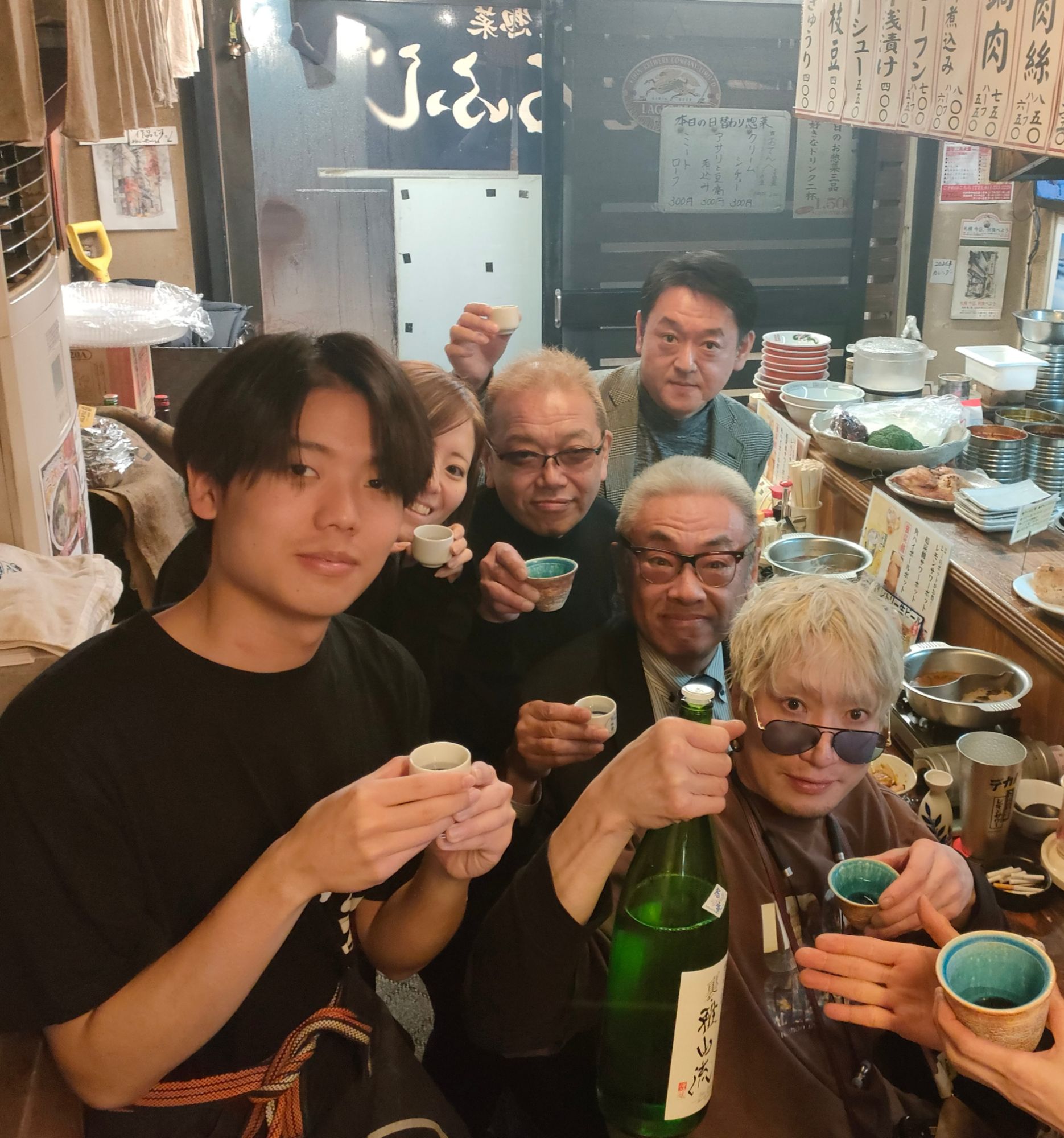 お店が忙しかったわけでも、この日本酒を飲み過ぎた訳でもなく、まるふじはこの撮影したあとてんやわんやになるのです!!(今年もよろしく〜の、ななえちゃんと潤弥。チーフも正面向いてて良し)