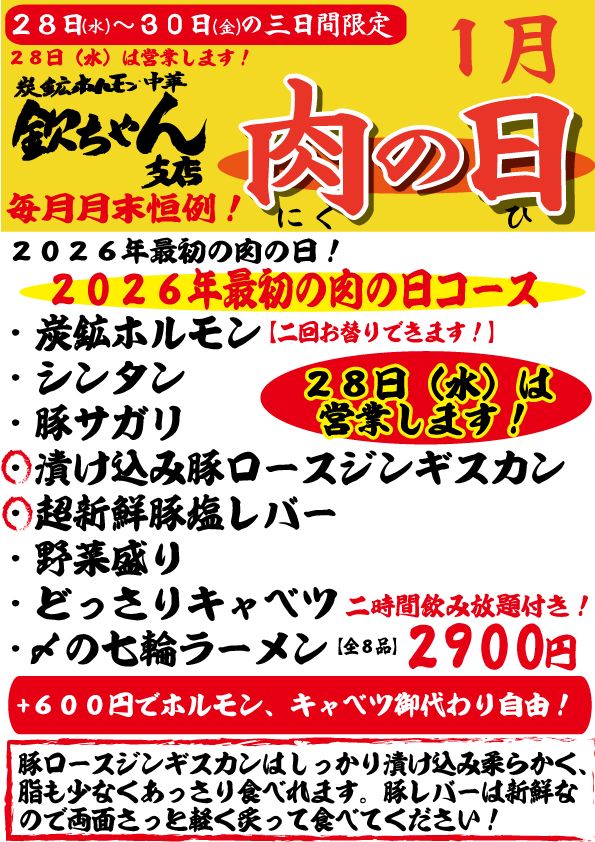 本日営業しております肉の日初日 2026.01.28 皆さんこんにちは欽ちゃん支店の白木です、 今日は営業しておりますよー! 肉の日初日でありますよ。 御来店お待ちしております! 明日は営業しております前の記事