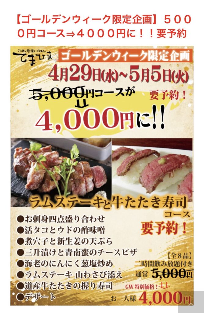 てまひまではGWスペシャル企画としまして、通常5000円のラムステーキと肉寿司の肉肉プランのコースをなんと4000円で提供いたします‼️