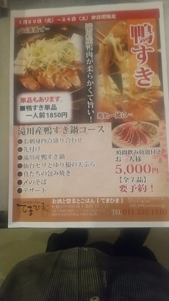 皆さん、こんにちは、タカです。どかっと、雪が降って出勤や雪掻きに時間を取られて大変だと思いますが、今日から、木曜日までの4日間限定で、滝川産鴨すき鍋🍲コースと単品で、やりますよ🎵😆一人でしみじみと食べるのも良し❗️皆でワイワイと食べるのも良し❗️食べ終わったら、〆の蕎麦も美味しいので、是非、皆さん、食べて下さいませ✨😆それでは、本日も、皆さんのご予約、ご来店、お待ちしています❗️😁