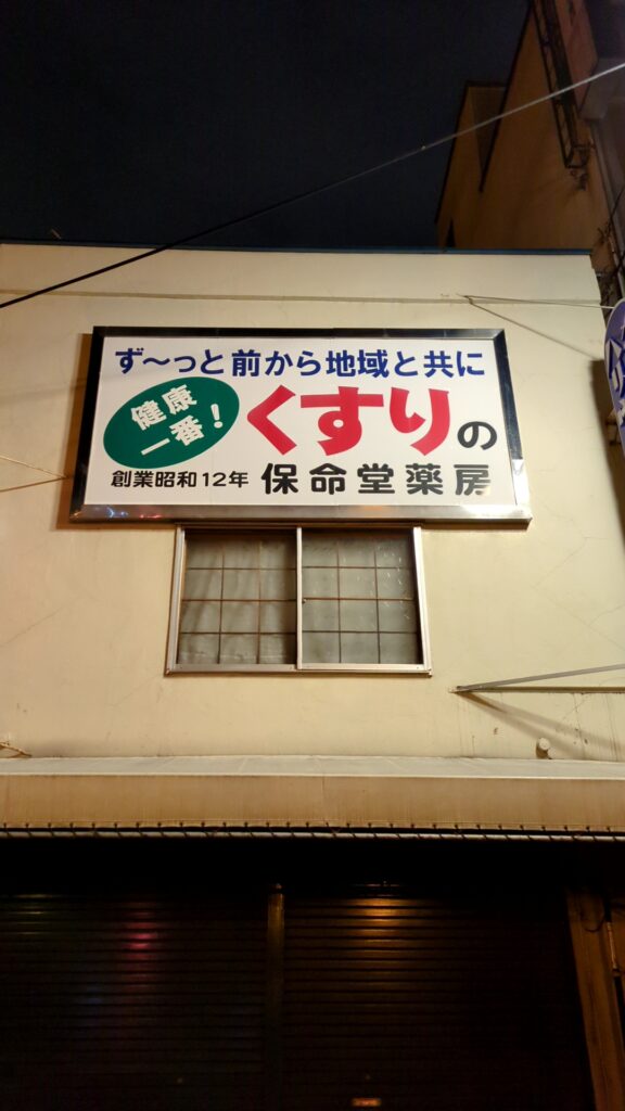 しかも、「健康一番!」と書いてるだけあって「くすりの保命堂薬房」だもんね。