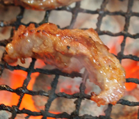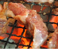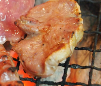 炭鉱ホルモンを焼いた後の七輪は火が落ち着き、ちょうど良い熱で赤身を焼いて食べます。