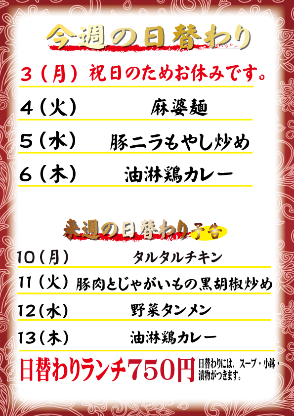 【ランチ営業】(ランチ金・土・日お休み)(月~木)11:30~15:00