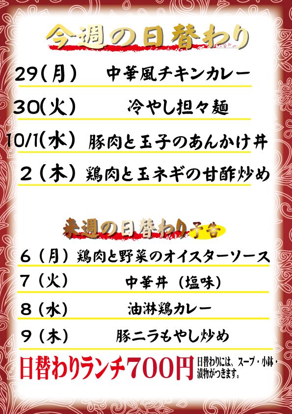 今週も 2025/09/29 12:07 ランチからディナーまでどうぞよろしくお願いいたします!! 明日の日替わりランチは【冷やし担々麺】ですよ~。(まだ冷やしなのね?ギリですかな?笑) 実は、ランチもご予約可能です! ディナーももちろん、ご予約頂けたら喜んじゃいます(笑) 本日もご来店お待ちしております!! 53位でした!前の記事 水滴?本日のお惣菜です!次の記事