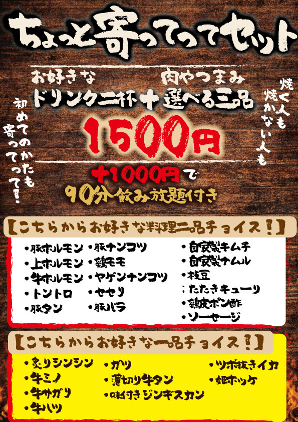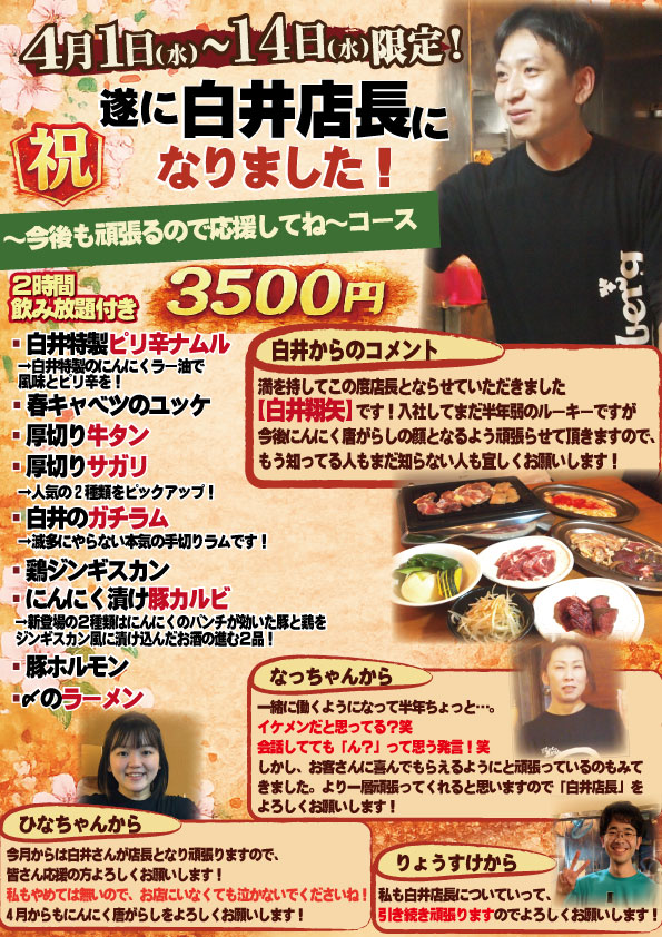 【4月1日~14日まで】白井店長になりました!コース! 【4月宴会】どこまでも『タン』で一緒に送り出す! WEBからのご予約はこちらから 飲み放題メニュー 【焼く人も焼かない人も、初めての方も】ちょっと寄ってってセット!ドリンク2杯+選べる3品