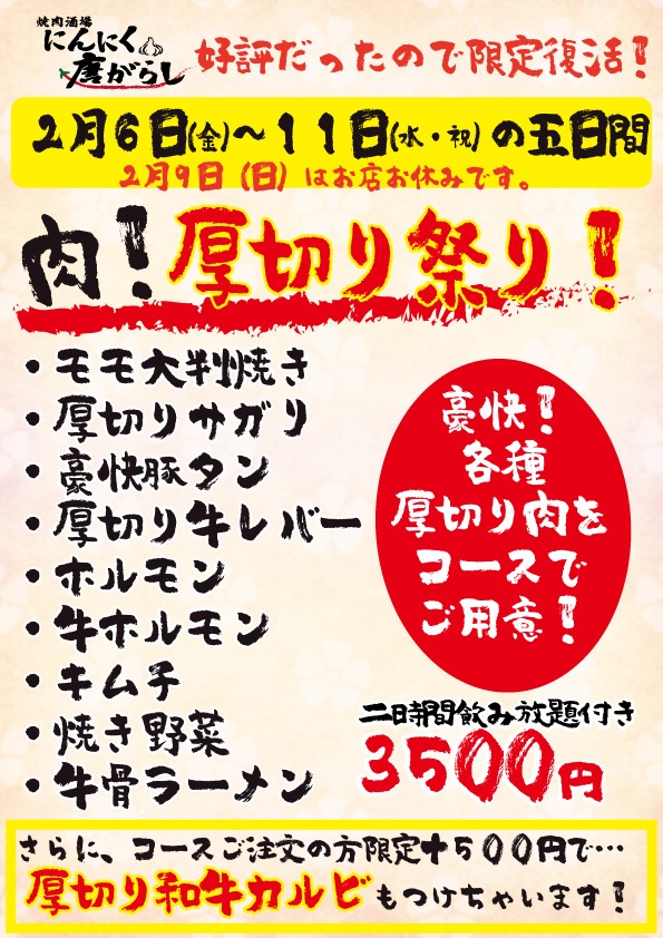 期間限定! 2026.02.9 未分類 本日から1週間ほど限定で 【白井コボさん】です! はい、刈り上げました!コボさんと言いたい人は是非来てみてください!? こちらも期間限定!11日までの厚切りコースは残り少しでまた食べれなくなってしまいますよ! まだ食べてない人、最後にもう一回!そんな人達是非ご来店お願い致します! 12日からは恐れてたあのコースが、、! 乞うご期待! 投稿者: ninkara@katoshoten.jp 未分類 15時から!前の記事